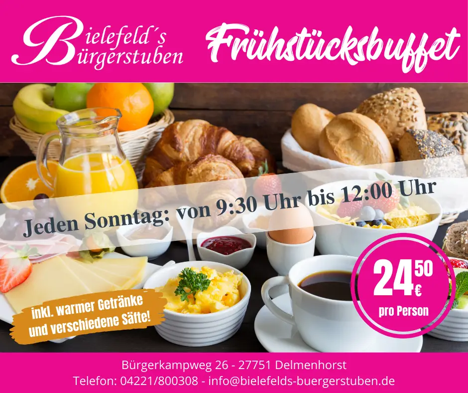 Unser Frühstücksbuffet ist weit über die Grenzen von Delmenhorst hinaus bekannt. Jeden Sonn- und Feiertag bereiten wir für Sie eine reichhaltige Auswahl an frischen Brötchen, Aufschnitten, Fischplatten, Speck mit Rührei, Puffer, Pfannkuchen und vielem mehr vor. Gäste aus Delmenhorst und Umzu schätzen unsere große Auswahl und die gemütliche Atmosphäre. Aufgrund der hohen Nachfrage empfehle ich Ihnen dringend, frühzeitig zu reservieren, damit Sie sich einen Platz für ein genussvolles Frühstück sichern können.